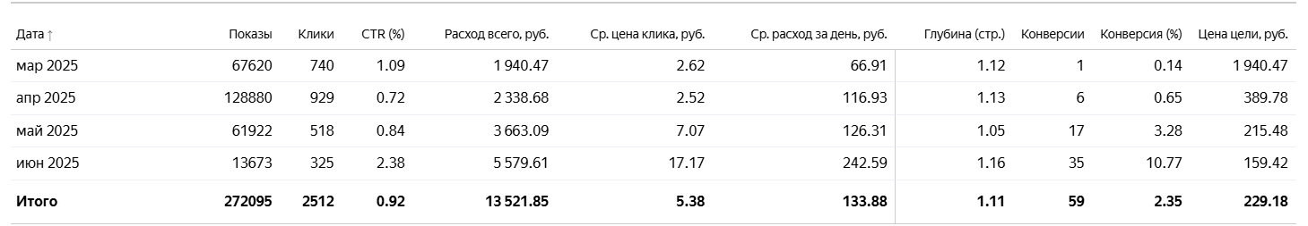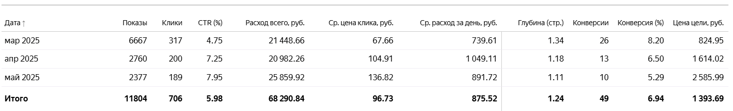 - Ежедневно проводилась оптимизация рекламной кампании для занятия верхних позиций рекламной выдачи в поиске, а также минусация неподходящих площадок в РСЯ и слов, по которым рекламные объявления в поиске не показываются аудитории
